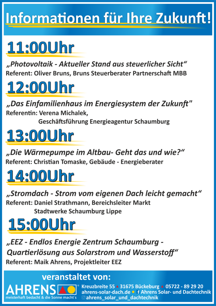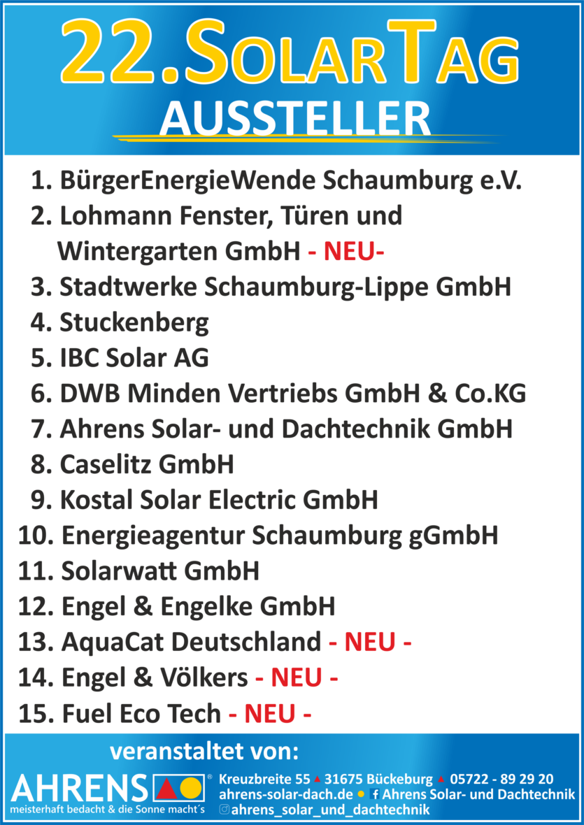 14.02.2026 22. SolarTag Markus2026-02-11T11:54:15+01:00 Veranstaltungen 14.02.2026 22. SolarTag Bückeburg, Rathaussaal, 10 bis 16Uhr Eintritt frei