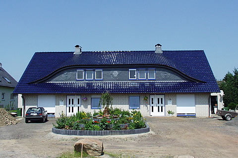 Ein Doppelhaus in Seggebruch der exklusiven Art. Mit den blau-glasierten Hohlfalzziegel und den geschwungenen Gauben eine besondere Anforderung. Die Eindeckung ging an die Grenzen des machbaren, die Unterkonstruktion und Lattung mussten mehrfach angepasst werden.