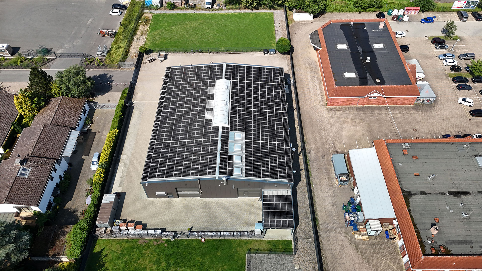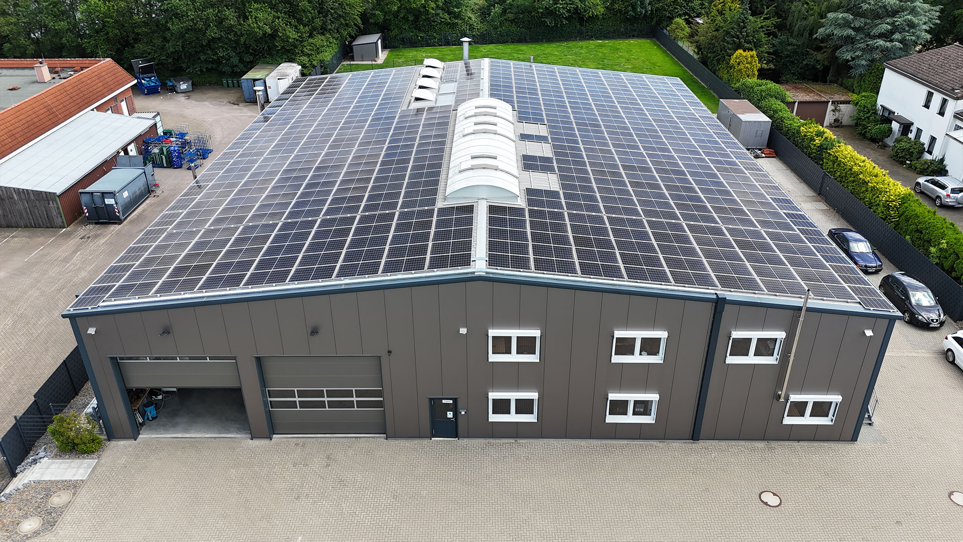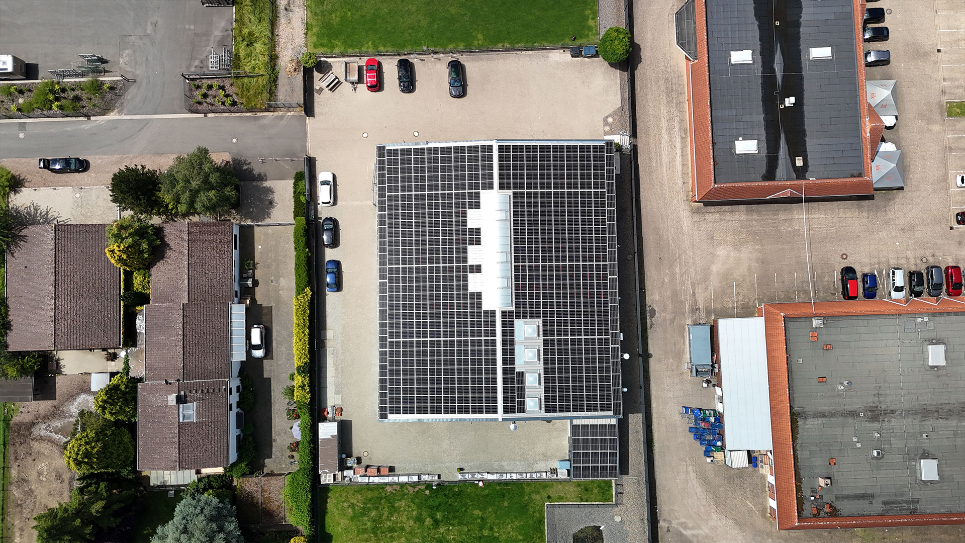 Auf diesem Dach wurde jeder Zentimeter genutzt, um Sonnenstrom zu erzeugen. 475 Module, mit der Einzelleistung von 410Wp, wurden auf das Firmengebäude in Bückeburg montiert und zwei Wechselrichter (1x 50kW, 1x 110kW), mit der Gesamtleistung von 160kW, installiert. Des Weiteren wurde ein Speichersystem mit der Kapazität von 19,2kWh angeschlossen. Die Leistung der Photovoltaik-Anlage beträgt 194,75kWp. Für die Elektromobilität hat sich unser Kunde außerdem noch für drei Ladestationen entschieden.