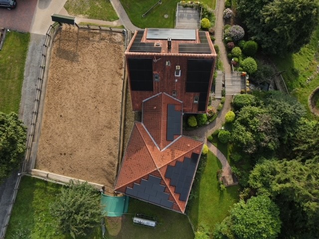 28,86kWp Gesamtleistung hat die Photovoltaik-Anlage auf diesem Dach. Dafür wurden 78 Module mit der Einzelleistung von 370Wp montiert und zwei Wechselrichter installiert (1x10kW, 1x17kW). Außerdem wurde ein Batteriespeichersystem mit 15,4kWh Speicherkapazität angeschlossen, sowie eine 11kW Ladestation für Elektromobilität.