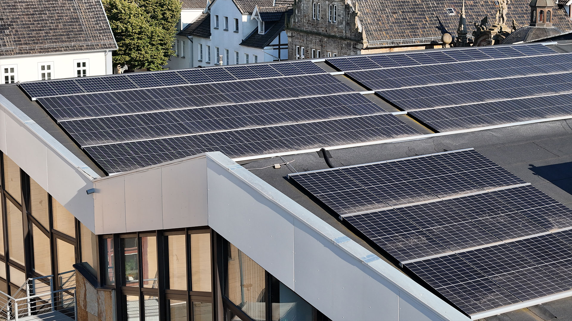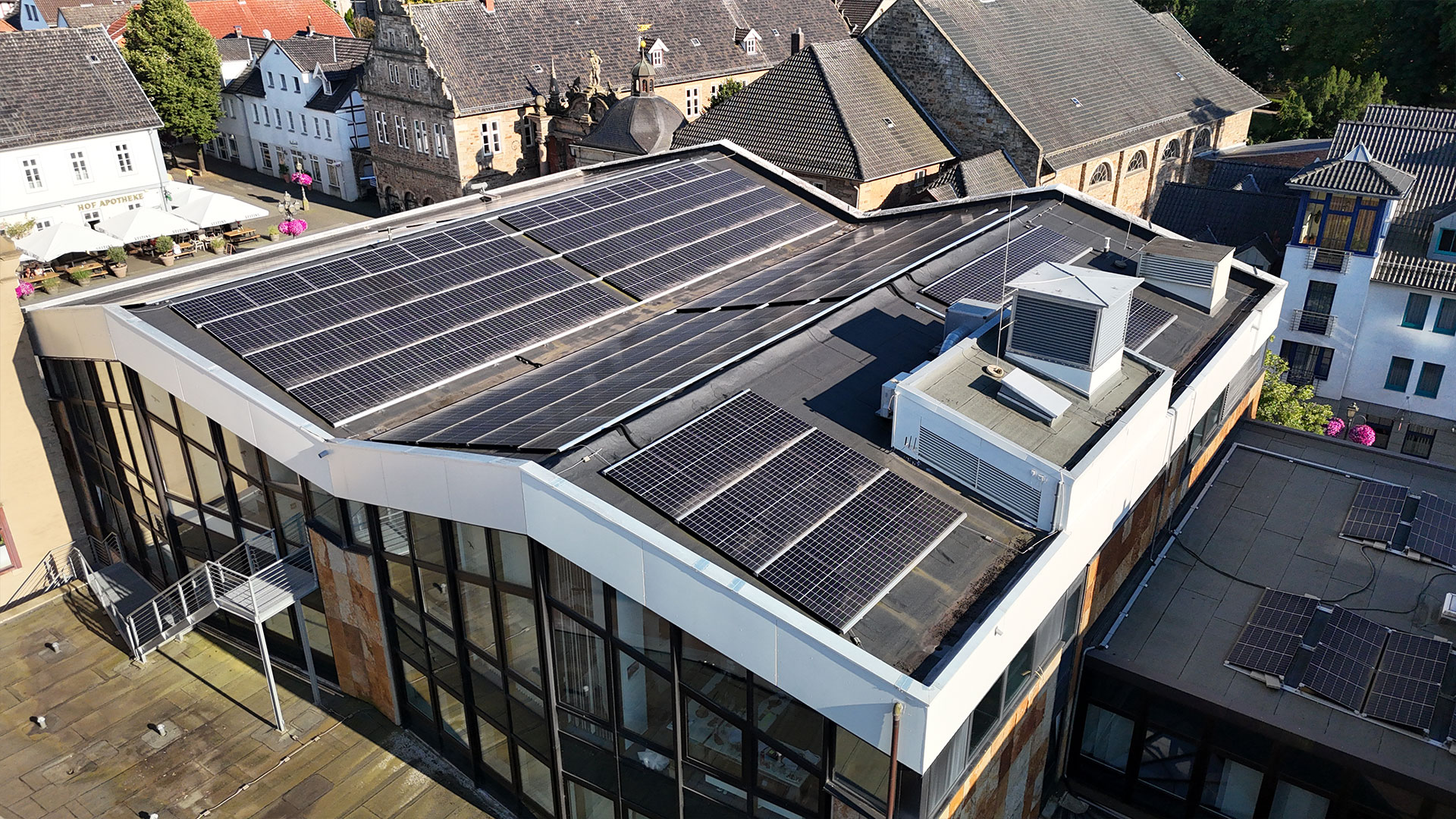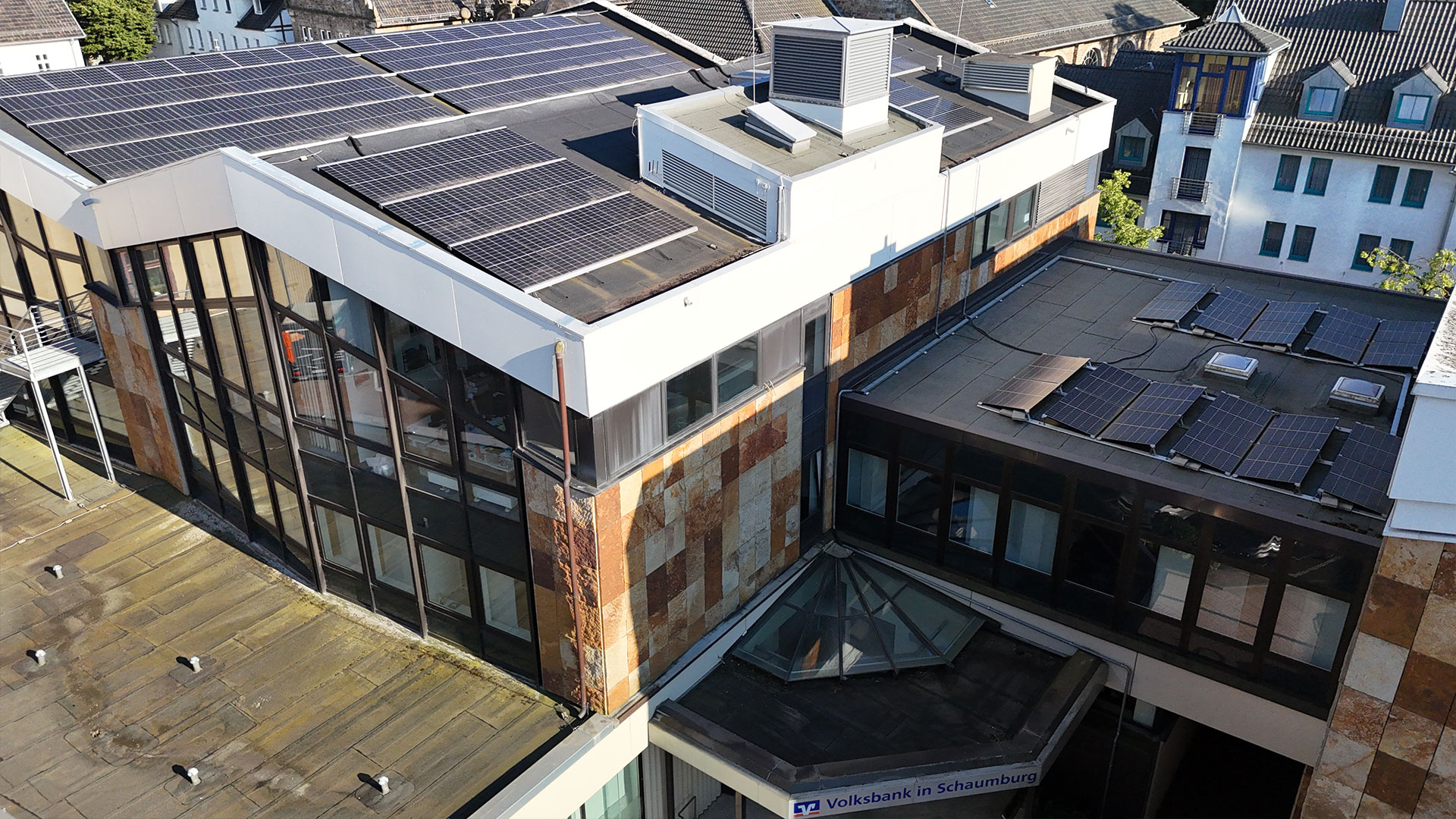 Diese Photovoltaik-Anlage auf dem Bankgebäude in Bückeburg kann sich sehen lassen, denn der Platz auf dem Dach wurde fast vollständig genutzt. Die Modulleistung von 99,630kWp besteht aus 246 Modulen, mit der Einzelleistung von 405Wp.